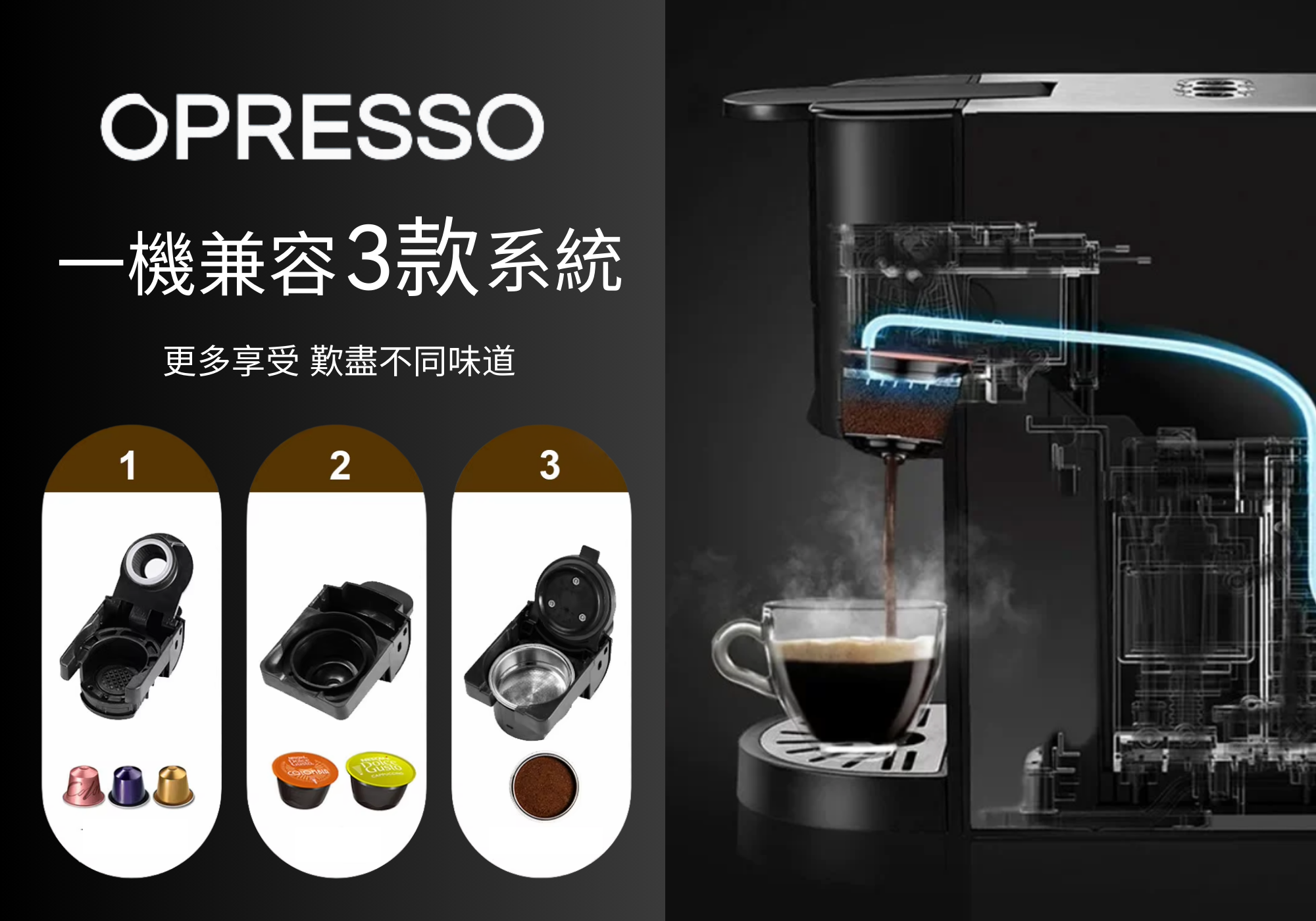 Opresso 咖啡機,一按即沖方便快捷,不論在家中、辦公室,輕鬆簡單沖好一杯高質咖啡/茶飲。Opresso coffee machines are quick and convenient with one-touch brewing
